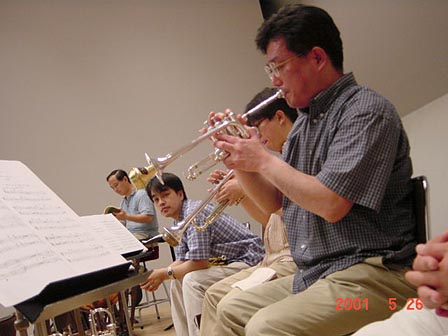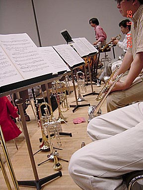 植村氏の、このような生き生きとした顔は、 練習場では絶対に見ることが出来ません。 この日は、明日にも練習が控えている 為、トロンボーンパートも珍しく早めに (午前2時半)切り上げて、帰りました。 |