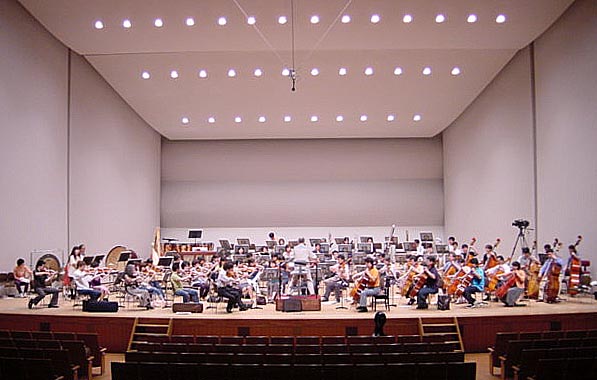 トロンボーンの席から見た指揮者とオーケストラと客席です ヴァイオリンと距離的に遠いため、客席に音が到達するのに時差が生じます。 |