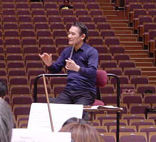 一週間後の12月9日の、ステージでのリハーサル風景です。 ここ、宮崎市民文化ホールは、だんだん響きが良くなっているように思います。 山岸先生の朗々たるホルンの音色が響き渡りました。 |