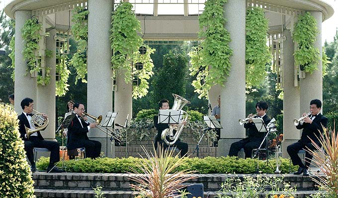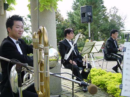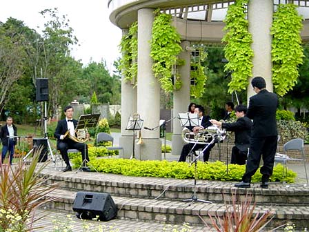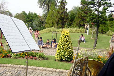 | 良い天候に恵まれ、野外の「月のガゼボ」で演奏を行いました。 1日3回、一回30分のステージです。 |