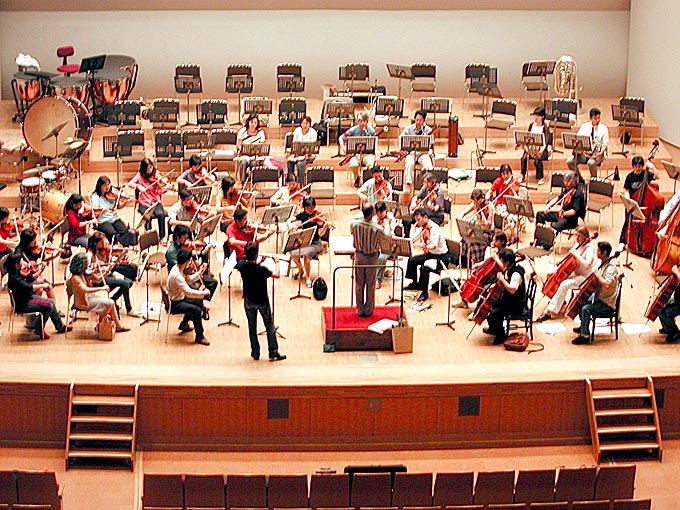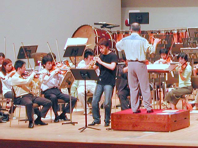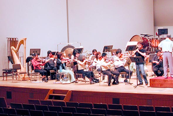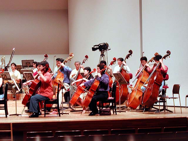 今回は、チューバのま〜さんが、写真を撮ってくれました。 しかし、演奏会らしい写真はこの一枚のみで、あとは、宴会のそれも、カメラマン好みのしか写ってませんので、あしからず〜〜。 トロンボーンが緩みきっている所を見ると、ブラームスの1〜3楽章のようです。 チェロの川添さんが、遠〜い所を見てますね。 |
