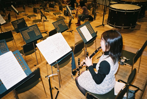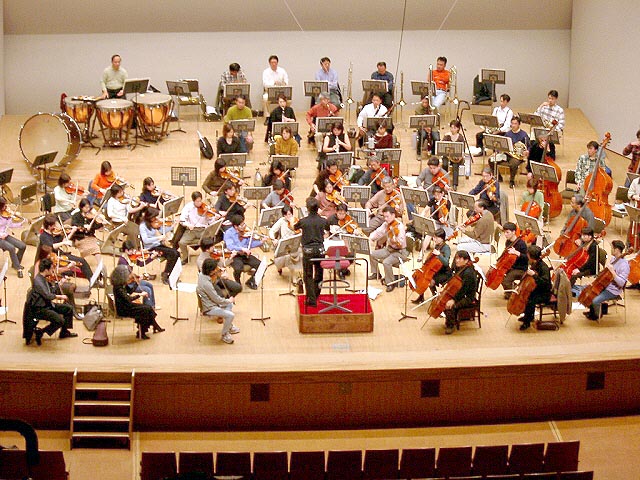 今回は、チューバのま〜さんが、写真を撮ってくれました。 しかし、演奏会らしい写真はこの一枚のみで、あとは、宴会のそれも、カメラマン好みのしか写ってませんので、あしからず〜〜。 トロンボーンが緩みきっている所を見ると、ブラームスの1〜3楽章のようです。 チェロの川添さんが、遠〜い所を見てますね。 |