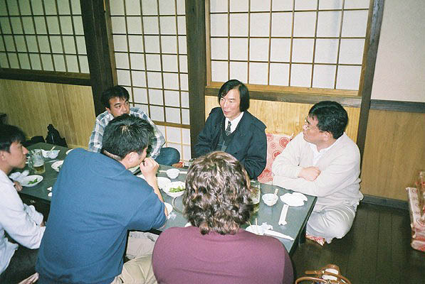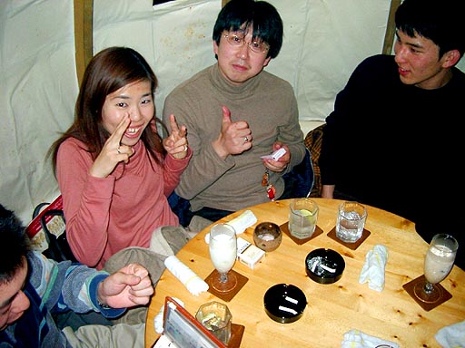 おっと、もう二次会だぁ。 今回は、TUTTIのパオの中です。 こっちは若者グループね。 境さん、ぎりぎり若者グループに入れてあげよう。 |