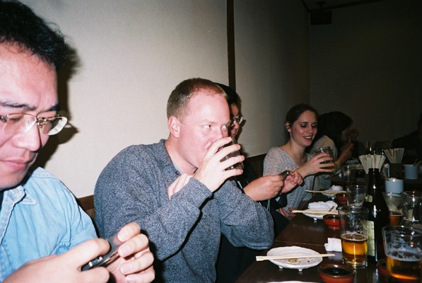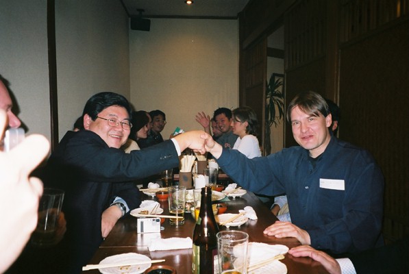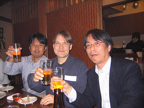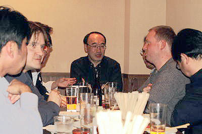 | アンドレアスさんと松原先生の再開で、懇親会が始まり始まり! 場所は、シティークラブのマスター一押しで、串焼き「KIDEN」にしました。 |