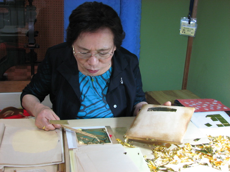 安江金箔工芸館での金箔製品化作業の実演。 0.1ミクロンの薄さの金箔。