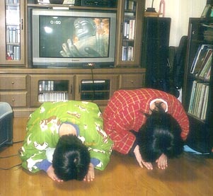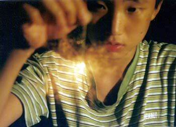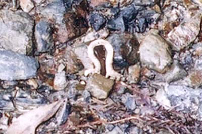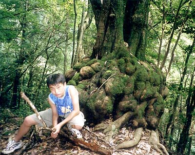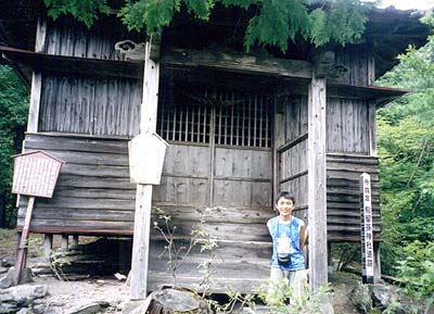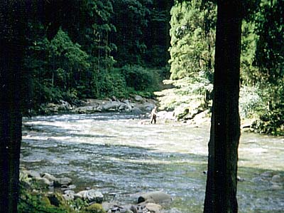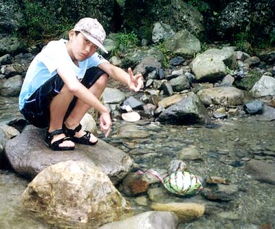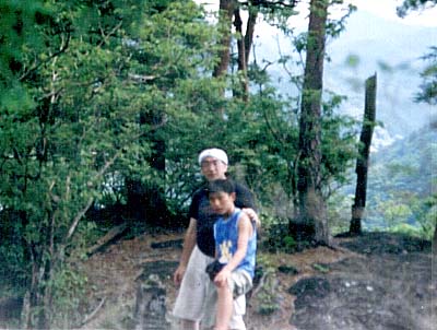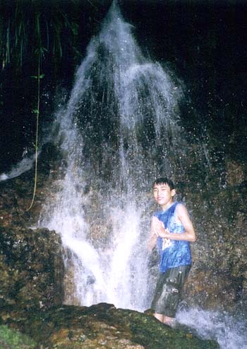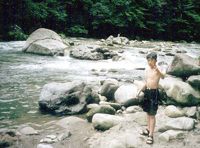 | ここの川での川遊びは、ものすごい水量による急な流れに逆らって、小さな滝を登っていく、「渓流登り」が、一番。 この写真なんか、一見どうって事無いようですが、実際目の前まで来ると、「ちょっと無理だな」というものすごい水量に圧倒されます。 この日玲翁成は、滝を登る途中で、二回ほど吹っ飛ばされて、流されていきました。 二回目は、ちょうど滝が落ちるところの岩に両手で抱きついて、何とかそれ以上落ちずにがんばっています。 何とか助けようと、私が足場を作って踏ん張り、手をさしのべます。 父「ファイトォー!」 息子「一発ぁーつ!」 何とか助かりましたが、玲翁成によると流れていくときは、岩が目の前にぐんぐん迫り、怖いそうです。 |