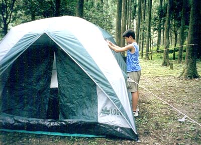 | 行ったときは、曇り空でしたが、すぐにテントの設営です。 ロゴスの6人用テントは、初めて使いましたが、すぐに設営が完了しました。 |