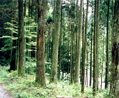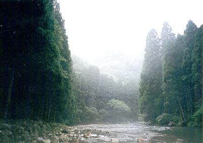 | 山を降りてきて、街道をキャンプ場へ向かいます。 また、3キロの道のり。 帰りは、遠かったなぁ。 美しい杉木立が、目を楽しませます。 |