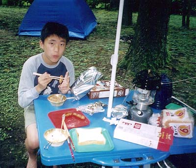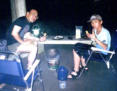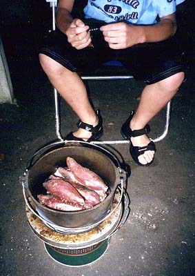 | この日は、他に2グループ6家族のキャンパー達と、一緒に泊まることになりました。 宮崎から来た5家族のグループは、皆とても陽気な方たちでした。 なぜか、奥さん達は皆美人でしたよ。 一日目のディナーは、定番中の定番、バーベキューです。 宝屋で、「はらみ」800gを買ってきましたが、予想通り、二人でペロリと平らげてしまいました。 飯ごうのご飯は、水が少なすぎて、芯があるのに焦げて、失敗! なかなか、おいしいご飯を炊くのは、難しいようです。 |