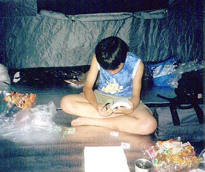4.7畳の広さを持つテントの内部はとても広く、蛍光灯型カンテラで、充分本が読める明るさになります。 | |