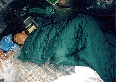 | 明け方近く、寝袋の中で爆睡中のレオナ。 明け方は、かなり寒くなります。 |