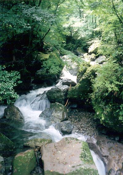 | さあ、朝の恒例の、ハイキングへ出発! 川に沿って、3キロ先にある、「狗留孫神社」へ行くことにしました。 往復6キロ。一時間半のはずでした。 |