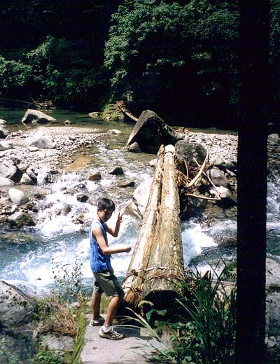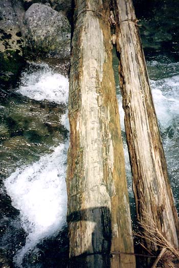 | これが、例の丸太橋。 手前と奥と、二カ所有るのですが、奥の方は半分壊れ欠けて、丸太一本を渡ることになりました。 |