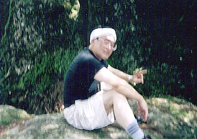 | 登りはじめると、それはそれはキツイ坂道でした。 よじ登るように登る箇所もたくさんあり、息が切れて、大変でした。 一度道を間違えて、別の頂上に行ったときの写真。 もう、くたくたで限界寸前です。 1.8リットルの水筒も、ほとんど飲んでしまいました。 |