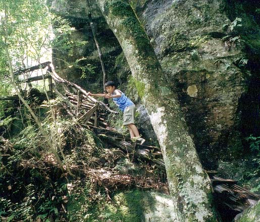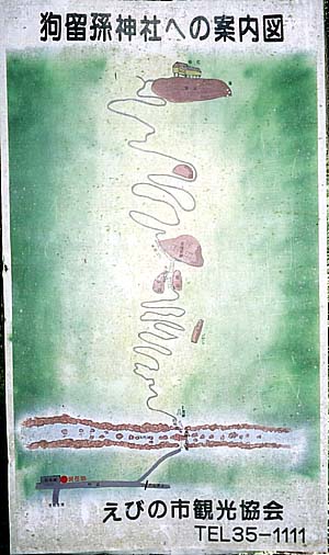 3キロ歩いて着いたのがこの看板。 左下の「現在地」から、川を丸太橋で渡って、縄ばしごと、はしごを登って、山頂にある狗留孫神社に着くそうで。 かなりぐったり来ましたが、ここで引き返すわけにはいきません。 何時間かかるか分からないけど、山頂を目指すことにしました。 |