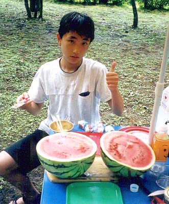 昨日川に冷やしておいたスイカは、食べ頃の冷たさ。 よく熟れていて、おいしそうでしょ? でも、これを二人で一気に食べるのは、やはり無理でした。 残りはクーラーに入れて、翌日平らげました。 |