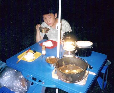 二日目のディナーは、これまた定番のカレーです。 でも、ダッチオーブンを使い、牛肉とミンチをふんだんに使ったこのカレーは、絶品でしたよ。 7.5皿分を、二人で、ペロリと食べてしまいました。(明日の朝食用でもあったのに) ご飯は、飯ごうで水の量を1.5倍にして、丁寧に炊いていったら、これも、今までで最高においしく炊けました。 |