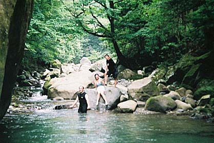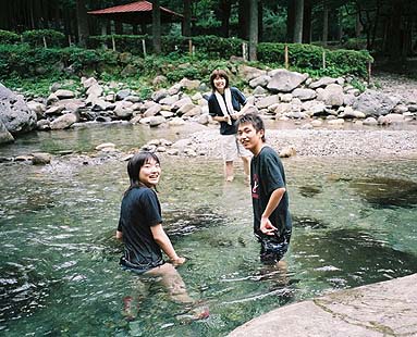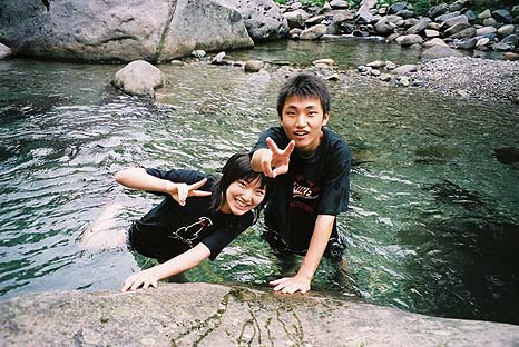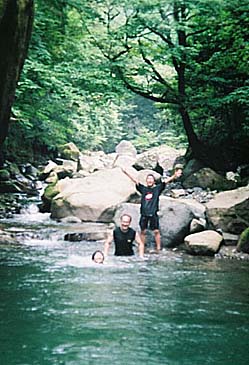 | キャンプ場に着きテントを張ったら、すぐに川で水浴び。 | ||