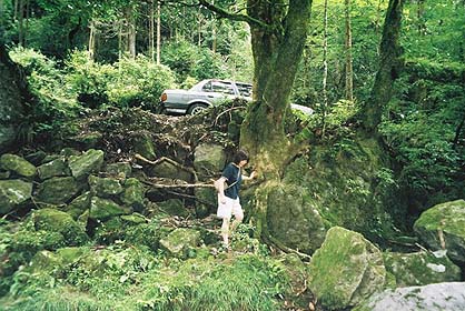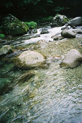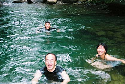 | 今年は、水不足のためか、川の水量が少なく、いつもの川をさかのぼっていく遊びが出来ません。 キャンプ場より少し上流に深い水場を発見。崖を降りていきます。 |