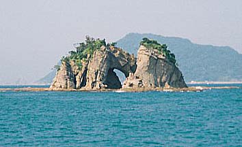 | この辺は、同じ日南海岸でも、風景ががらっと変わり、岩で出来た島が多数あります。 この無人島にも渡ってみたいな。 |