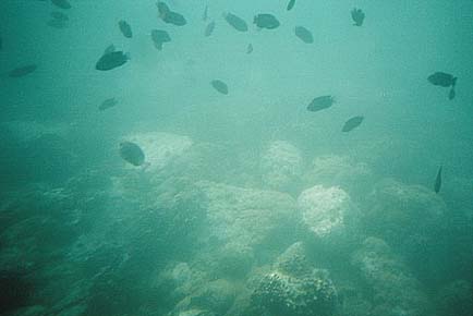| ポイントに着くと、船底にある水中展望室に移動して、魚や珊瑚を間近に見ることが出来ます。 船上から餌を蒔くので、魚がすぐに寄ってきます。 |