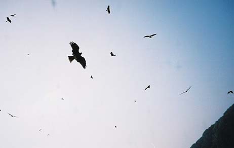 | ここで、見物は、野生のトンビによる、急降下キャッチです。頭の上から、船の屋根すれすれに急降下してきて、海に蒔いた餌を足でキャッチして、急上昇していきます。 迫力満点。 トンビをこんなに間近に見ることは、まず無いでしょう。 |