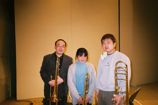 | こちらが今回ご一緒させていただくトロンボーンセクション。 お二人は地元鹿屋の吹奏楽団の方ですが、3人とも息はぴったりで、前々から一緒にやっているようでした。 | ||