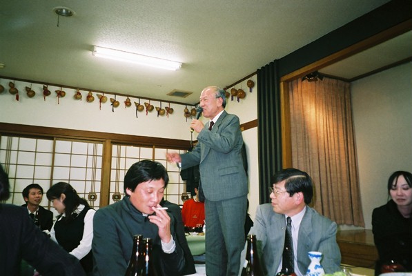 | さあ、「反省会」という打ち上げの始まり始まり〜。 来賓に教育長さんもお見えになり(隣の席で困った(^_^;) )、盛り上がりましたよ。 手前右側は、団長の風呂井先生。手前左は、指揮者の前田先生。 バイオリンを弾かれる、元海上自衛隊パイロットの方のコメントは感動的でした。 |
