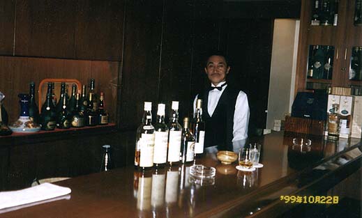 Bお店の内装。カウンターの後ろの壁一面に、とっておきのウイスキー・ブランデーがぎっしり詰まっています。種類は千種類を越えるとか。古いアイレイウイスキーを飲んでいます。